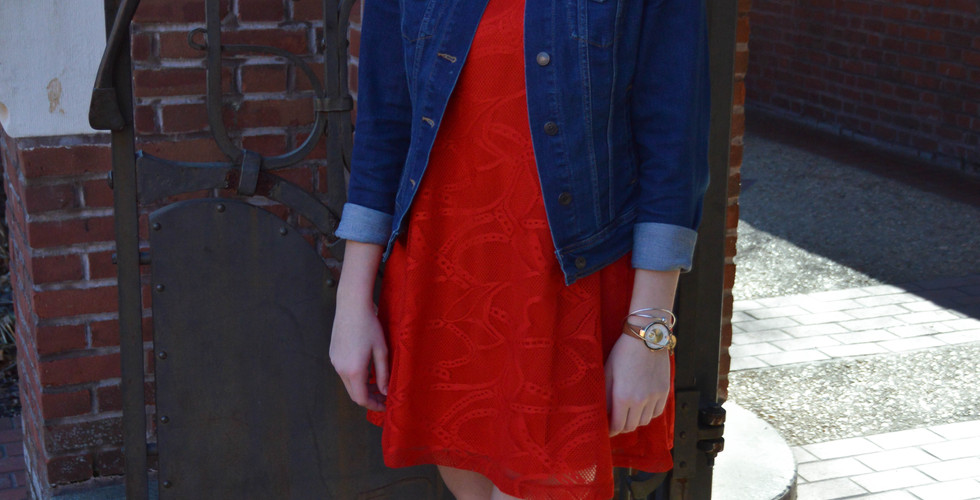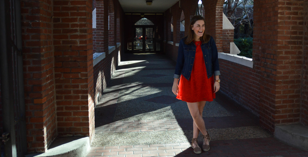 First, this shoe can be dressed up with a dress and a jean jacket. If you have read my blog in the past, or simply if you have paid attention to the photos used throughout it, you will recognize this dress. I find that it is the perfect combination of dressy and casual. It is extremely comfortable since it isn't formfitting, and the color just screams for spring and summer. Adding a jean jacket over top provides some warmth (which is necessary in Iowa right now as it is very between seasons) and adds some texture and color contrast to the outfit. I had so much fun goofing off in this outfit!!